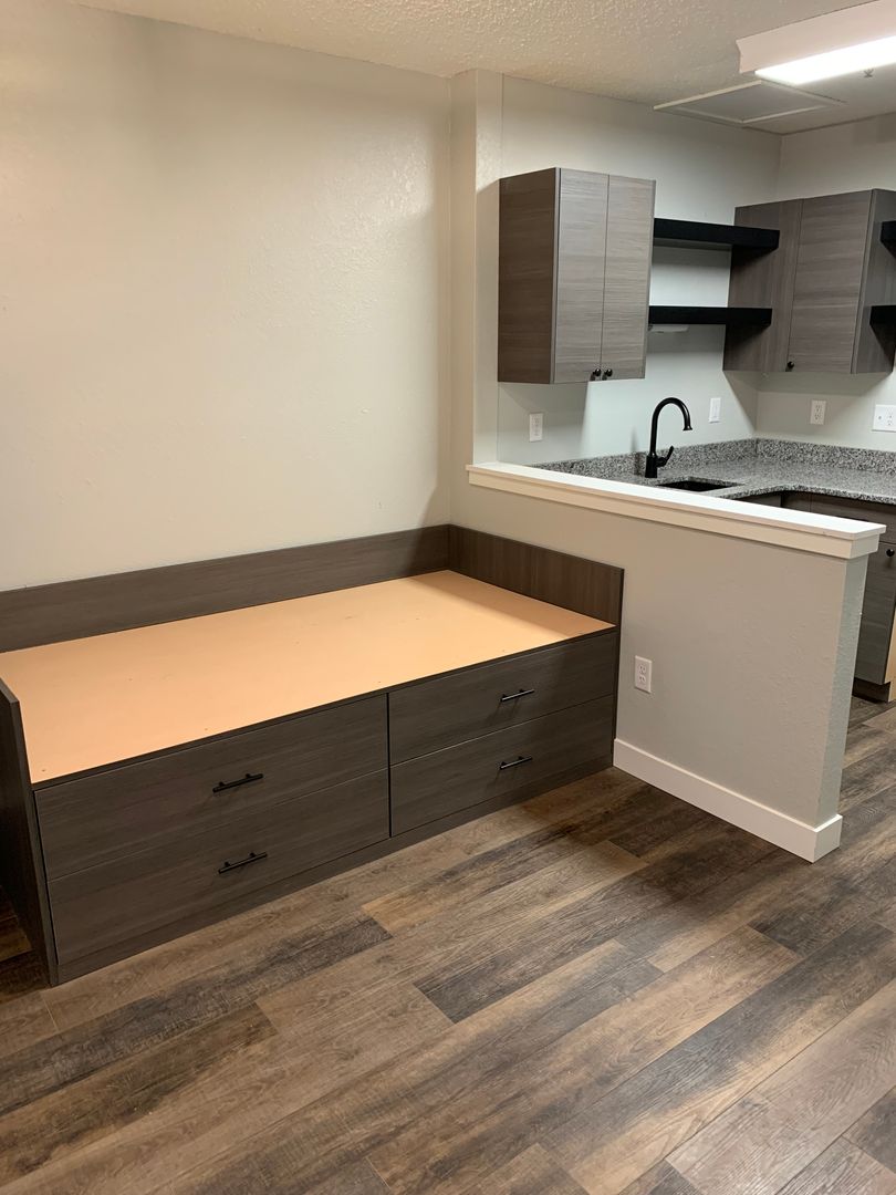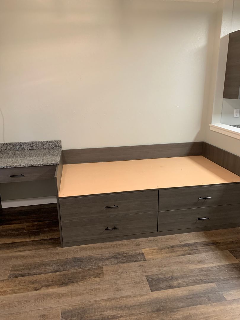 Cherry Square is located in the heart of downtown Mankato. This efficiency apartment has been fully remodeled. Custom cabinets were built to accommodate a twin size mattress with under bed storage, as well as desk/work station and tons of built in storage throughout. We packed a lot into a little space! Complete with new paint, appliances, vinyl flooring, kitchen cabinets, fixtures, and granite countertops, new bathroom vanities, shower surrounds and fixtures, along with new heaters and lighting in all units. Security building with elevator access and assigned parking. Under new ownership and management!